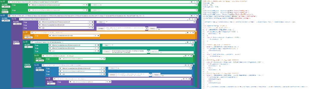 Trop compliqué à programmer par bloc (cela devient illisible), je passe donc à la programmation de ces scenarios en php - Dans cette utilisation avancée avec utilisation du php, Jeedom prend son sens : cette programmation s’intègre dans les scénarios d’une façon logique, on peut également mixer programmation bloc et programmation php.